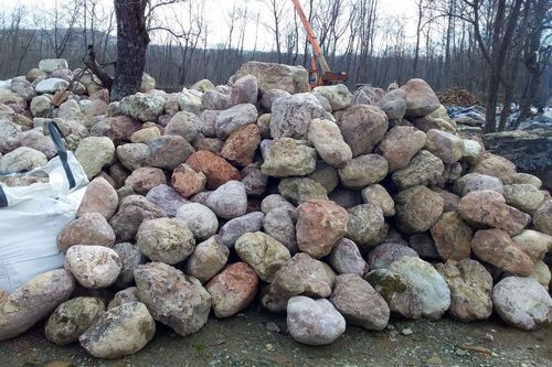 Валуны размером до 400 мм привозят в биг-бэгах. Валуны большим размером привозят навалом в фурах. В последствии их выгружают спецтехникой при использовании тн чалок.